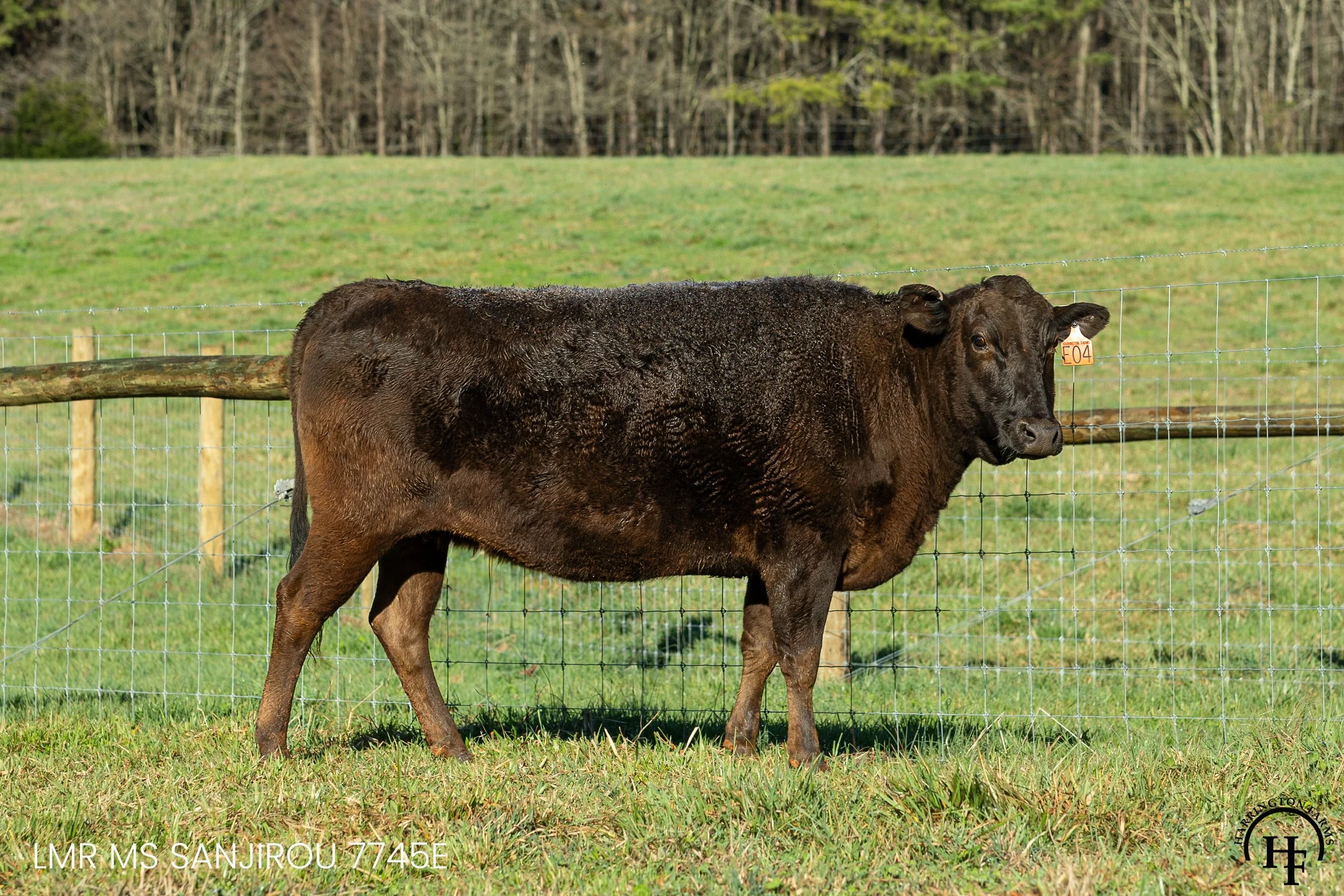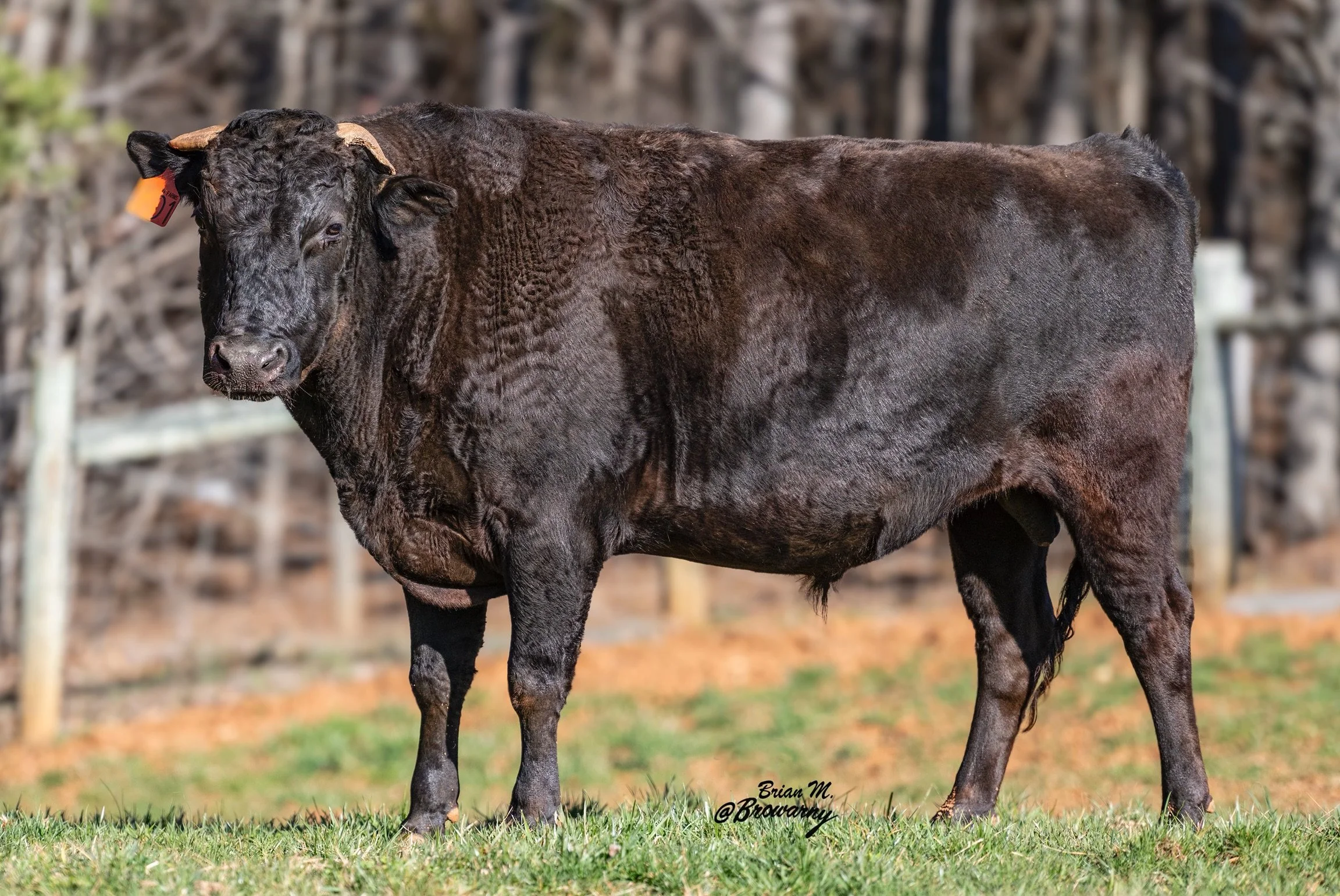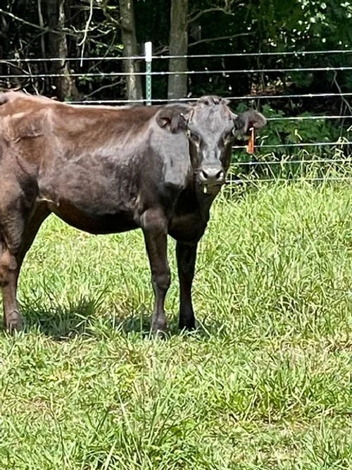 A black cow with a tag labeled 406 standing in a grassy field surrounded by a wire fence.