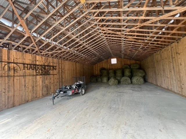 Empty barn with hay bales stacked in the back corner, a small trailer, and a logo saying Harrington Farms on the wooden wall.