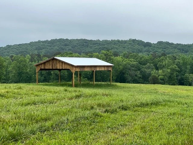 Open wooden shelter with metal roof in a grassy field, surrounded by trees and distant hills.