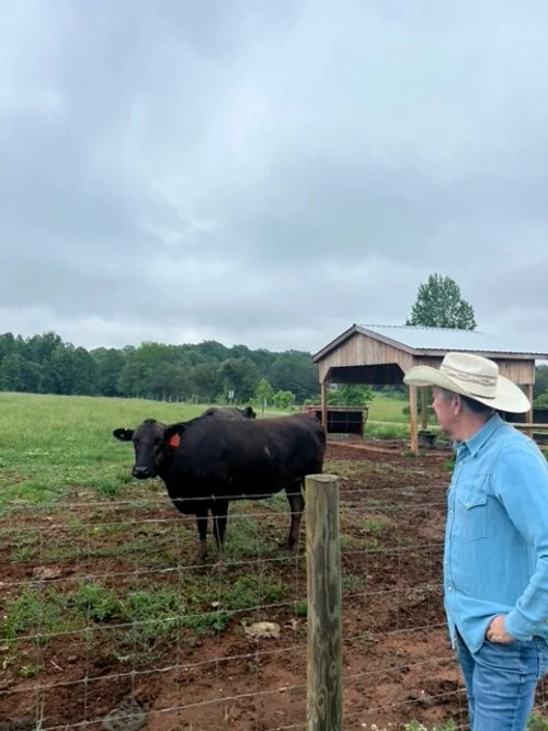 A man in a light blue shirt and wide-brimmed hat stands near a fence looking at a black cow in a field. There is a wooden barn and green trees in the background under a cloudy sky.