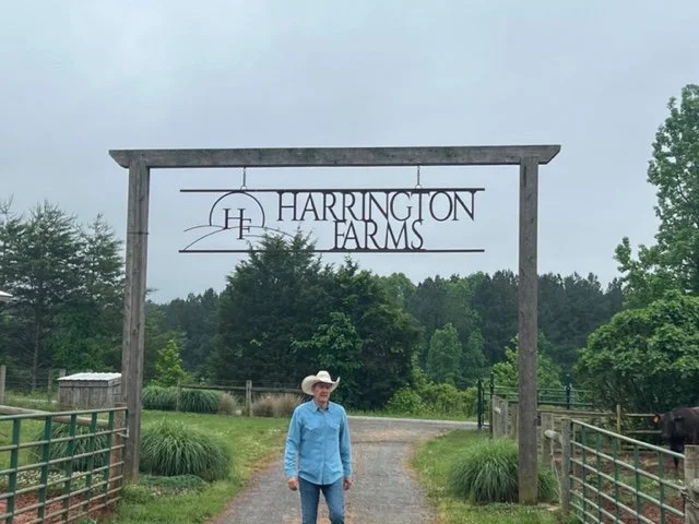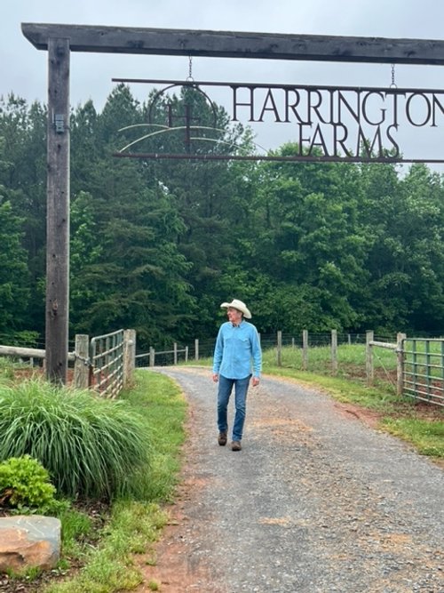 A person wearing a cowboy hat and blue shirt standing on a dirt farm road under a wooden sign that reads "Harrington Farms" with trees and farm structures in the background.