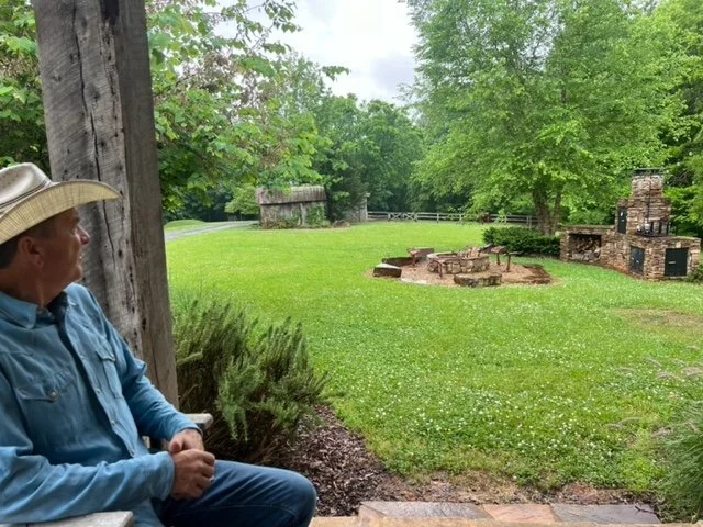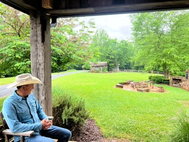 Person sitting on a bench under a porch, wearing a wide-brimmed hat and blue shirt, looking at a lush green yard with trees and a small brick fire pit area.