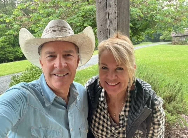A man wearing a cowboy hat and a light blue shirt, and a woman with blonde hair in a black and white checkered shirt and black jacket, smiling for a selfie outdoors in front of a wooden post and green trees.