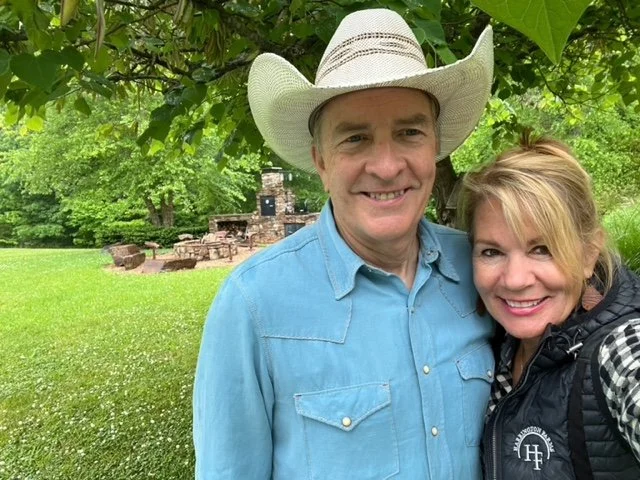 A smiling couple outdoors, the man wearing a white cowboy hat and a light blue shirt, the woman with blonde hair, a black vest, and plaid shirt, standing under green leafy trees in a park with a picnic area in the background.