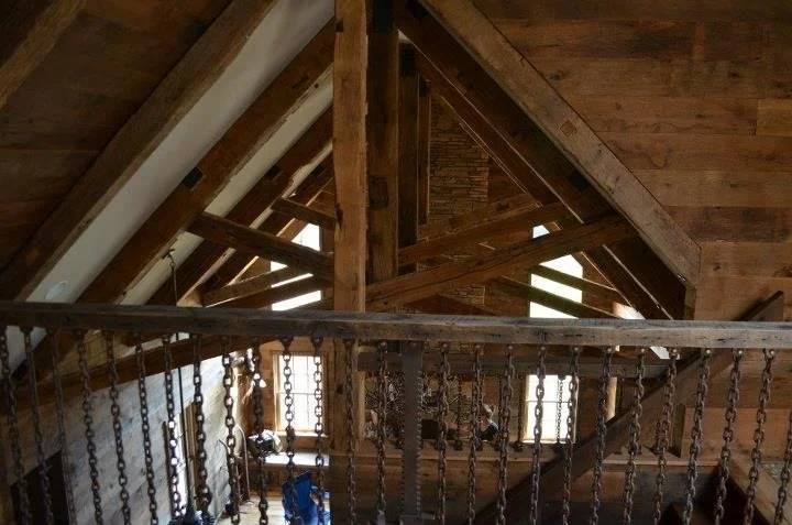 Interior view of an attic with exposed wooden beams, a high vaulted ceiling, and a wooden railing with metal chains.