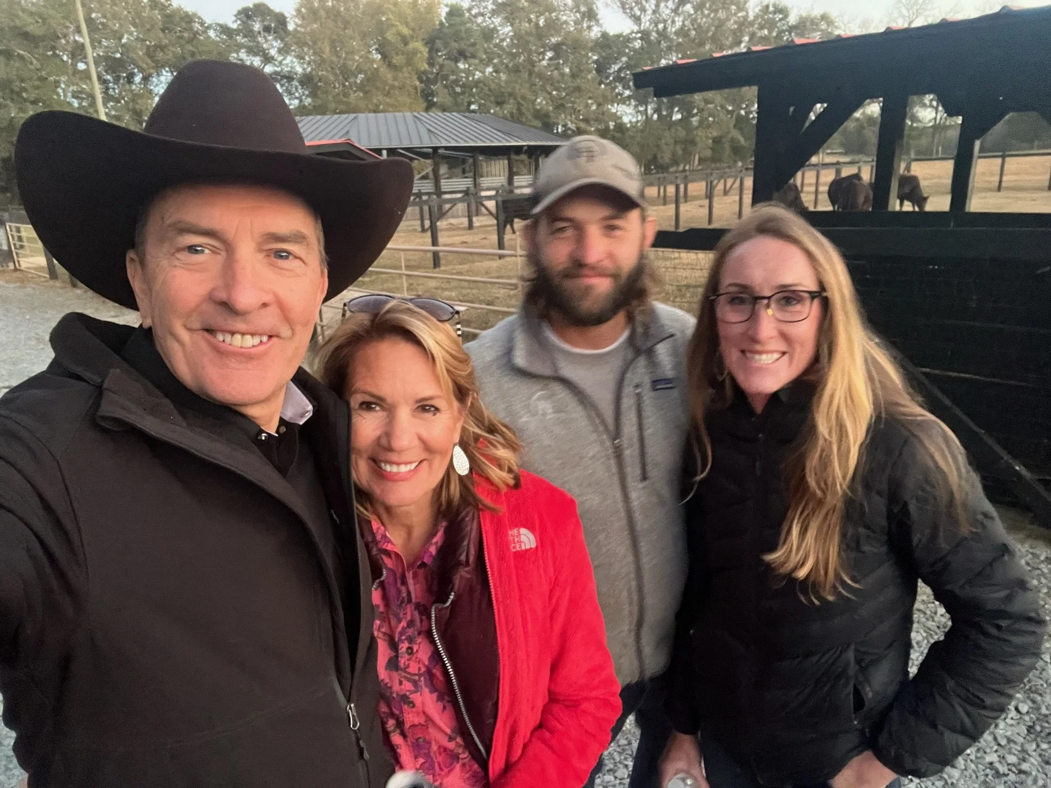 Group of four people taking a selfie outdoors at a farm, with horses in the background. The man on the left is wearing a large cowboy hat and black jacket. The woman next to him has blonde hair, earrings, and a red jacket. The man in the middle has a
