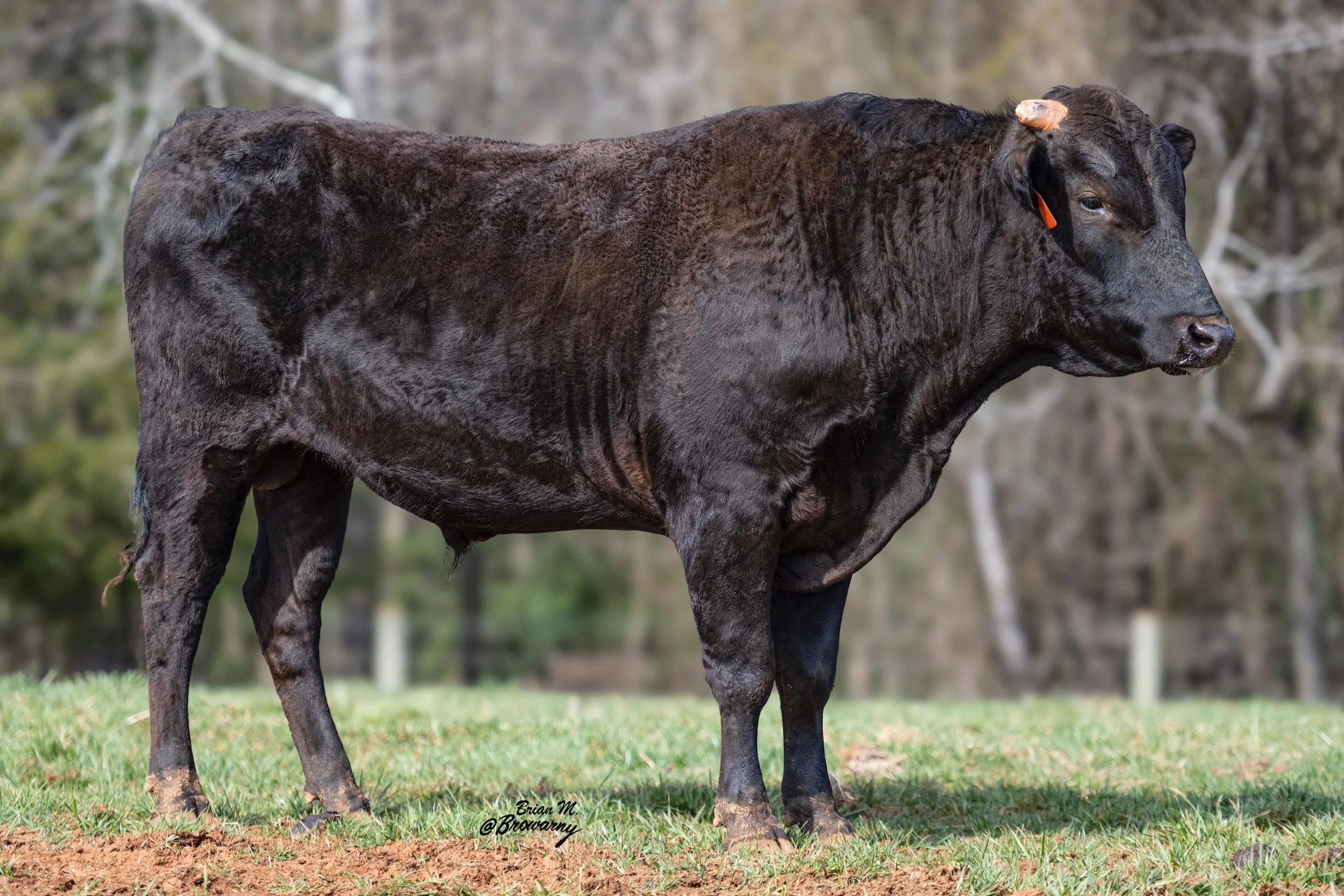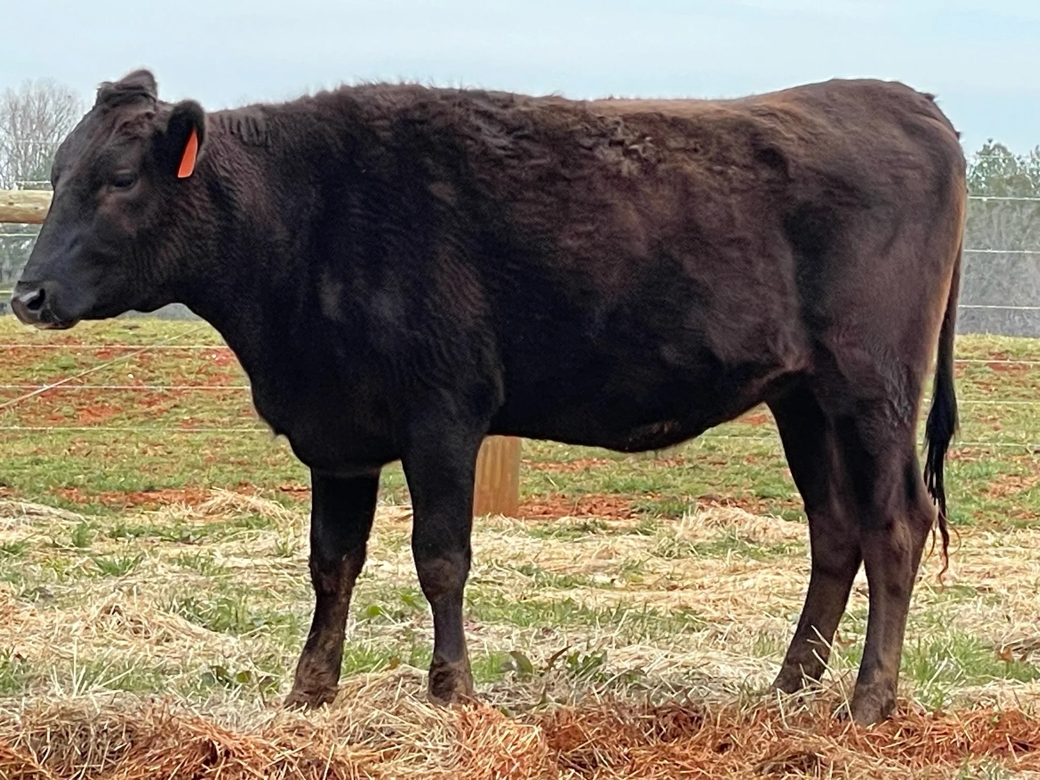 Black cow standing on grassy field with a wooden fence and trees in the background.