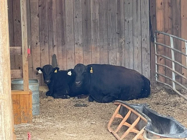 Three black cows lying on dirt floor inside a wooden barn or pen, with a wooden wall in the background and some farm equipment nearby.