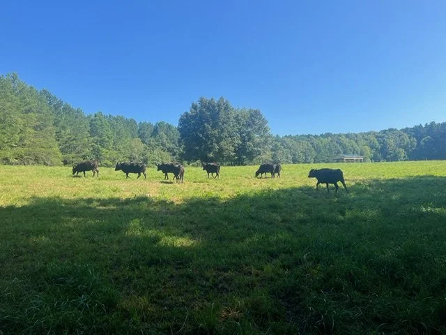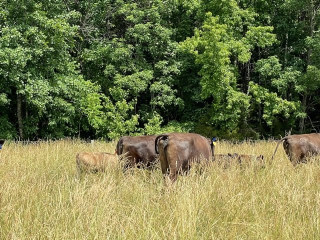 A herd of cattle grazing in a grassy field with a dense green forest in the background.