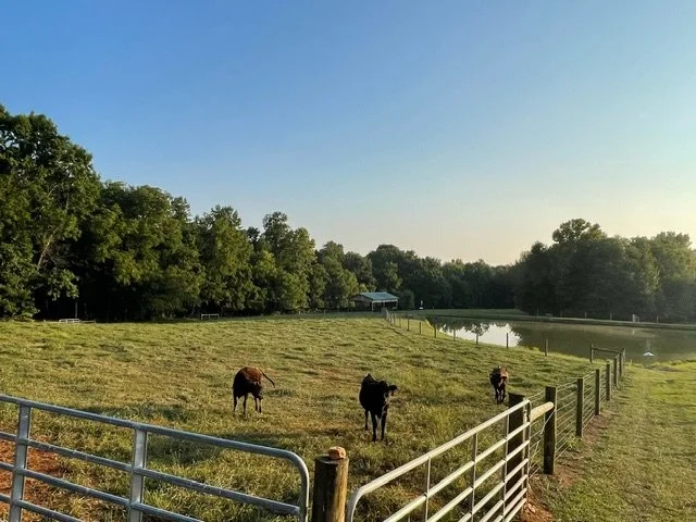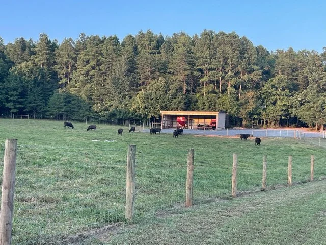 A pasture with black cows, wooden fence posts, and a barn in the background with a red tractor inside, surrounded by trees.