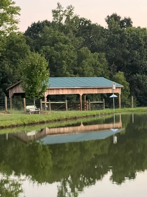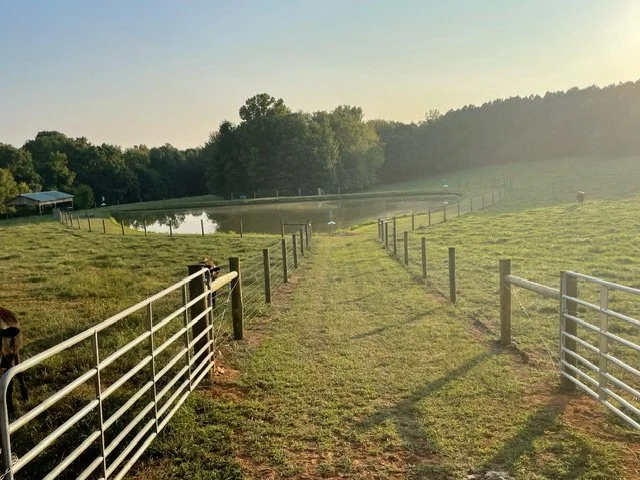 A rural farm scene with a dirt pathway flanked by metal and wooden fences, leading to a pond surrounded by lush grassy fields and trees, with a small shelter on the left and a distant horse grazing.