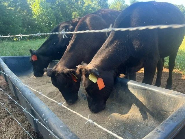 Three black cows eating from a metal trough behind a barbed wire fence, with green trees in the background.