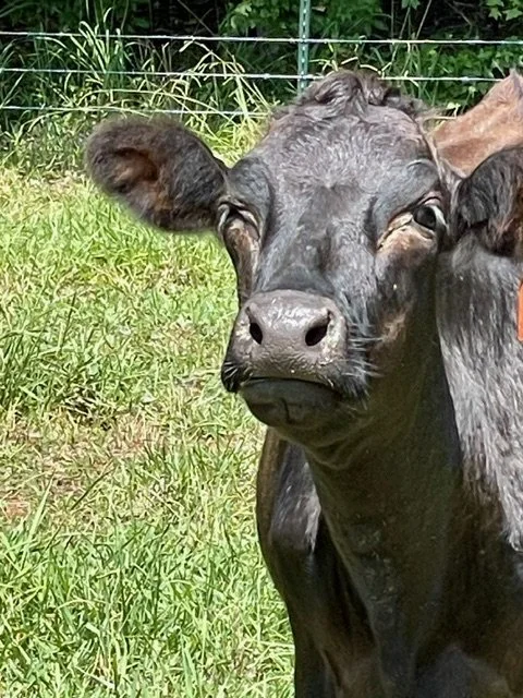 Close-up of a black calf with a tear in its eye standing in green grass with a fence and trees in the background.